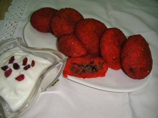 - يُسخن الزيت فى مقلاة كبيرة الحجم على نار أعلى من المتوسط، ويضاف إليه اللحم المفروم ويُحمر به حتى يأخذ اللون البنىّ.