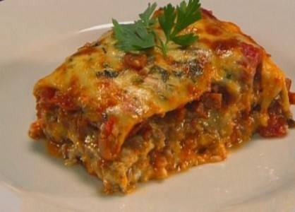 - تُضاف طبقة من شرائح اللازانيا ثم يوضع ثلث كميّة الباذنجان المقليّ و 6-7 ملاعق من صلصة الطماطم و مزيج الجبنة و طبقة أخرى من شرائح اللازانيا و يتم تكرار العمليّة نفسها لما تبقى من المكوّنات .