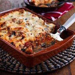 ٣. تُسَخّن السّمنة في الكفت نفسه ويُضاف الكرّاث والثوم المتبقّي ويُطهى ويُحرّك حتى يصبح الكرّاث طريًّا. ويُضاف السكّر ويُطهى ويُحرّك لمدّة 5 دقائق تقريبًا أو حتى يحمرّ قليلًا. وتُقطع ورقة لازانيا واحدة لتغطية قاعدة الصحن المقاوم لحرارة الفرن والمدهون بالزيت وهو بعمق 19 سم مكعّب (10 أكواب) ويوضع في مكانه. وتُكلّل ب ¼ الباذنجان و¼ خليط الكرّاث و¼ خليط البندورة (الطماطم) و¼ الجبن. وتُكرّر الطبقات 3 مرات وتُغطّى بالجبن. وتُخبَز من دون غطاء في فرن معتدل الحرارة لمدّة 50 دقيقة.
