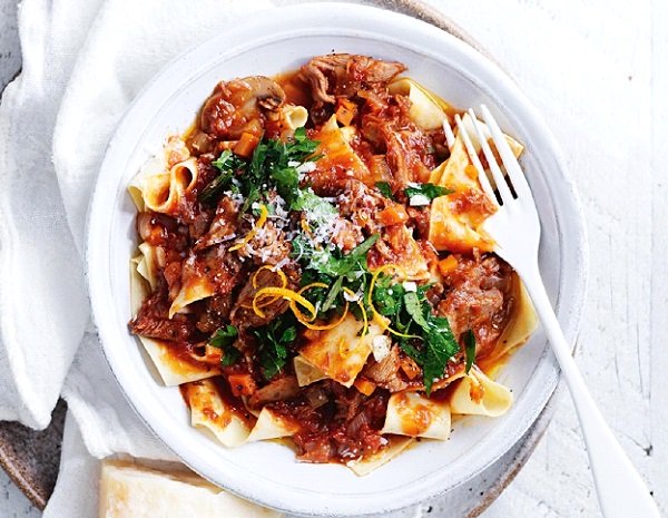 - نخرج أفخاذ الضأن بواسطة ملقط ونزيل العظام ثم نعيد اللحم إلى الصلصة . وفي هذه الأثناء نسلق الباستا حسب التعليمات الموجودة على المغلّف ثم نصفيها .