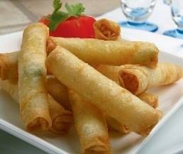 2. يوضع مقدار ملعقة كبيرة واحدة من مزيج الجبنة في إحدى الرقاقات على بعد 2 سنتم من الأسفل، ثم تُلفّ الرقاقة من الأسفل الى الأعلى.