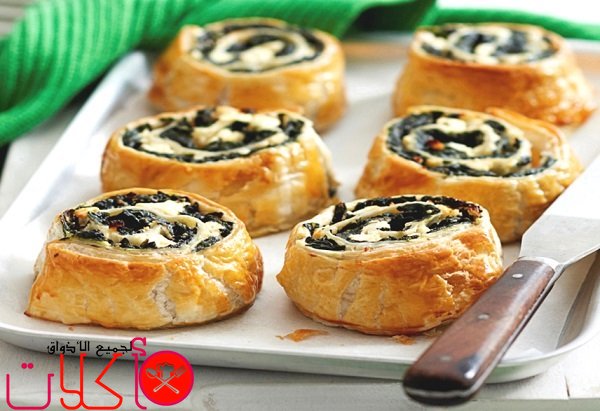 لفائف السبانخ والجبن ، لفائف عجينة البف باستري بحشوة السبانخ والجبنة والثوم، وتم خبزها بالفرن حتى تصبح بشكل ساخن وذهبي مقرمش، ونقدمها مع سلطة اللبن والخيار أو مع قطع الليمون الطازجة .