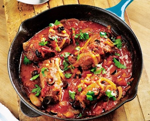 - نضع الزيت في مقلاة كبيرة على نار عالية ونقلي كل شريحة لحم حتى تكتسب لوناً على الوجهين ثم نضعها جانباً . نضيف شرائح البصل والثوم إلى المقلاة ونحرك على نار متوسطة لمدة 5 دقائق، ثم نعيد اللحم إلى المقلاة ونضع الطماطم المقطعة . نملأ نصف المقلاة بالماء ونضيف الزيتون ونتركها تغلي على نار هادئة لمدة 20 دقيقة مع التحريك من حين لآخر حتى تقل كمية الصلصة قليلاً .