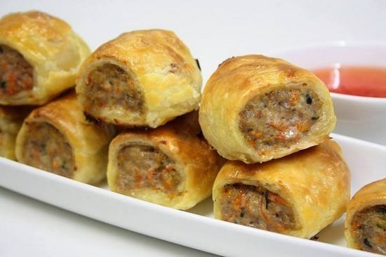 - يُسكب خليط اللحم كخط سميك على الطرف العريض من مُستطيل العجين، ويُلف العجين على الحشو على هيئة إسطوانة حتى يُغطيه، ثم يُقطع المُتبقىِ من العجين بالسكين.