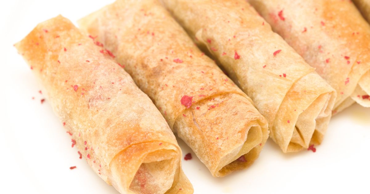 7- خذي عجينة رقاقات وضعي على الجانب العريض مقدار ملعقة كبيرة من الحشوة ولفيها على شكل رول واغلقي الأطراف الى الداخل. ضعيها في صينية فرن مدهونة بالزيت.