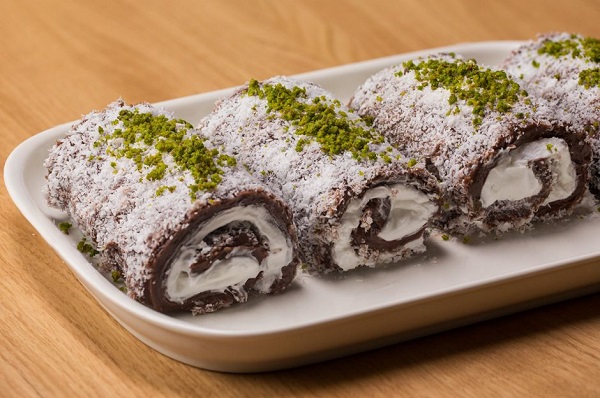 5. نفرد الكريمة على وجه الخليط الذي حضرناه وتم تبريده ثم نقطعه ونلف كل قطعة على شكل رولات صغيرة .