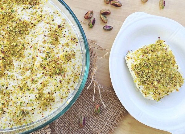 - نخفق الكريمة والسكر والفانيليا حتى يرتفع المزيج ثم نضعها فوق الطبق ونزين بالفستق ونتركها جانباً بينما نحضر القطر حيث نضع السكر والماء على نار عالية حتى الغليان ثم نضيف عصير الليمون ونغلي المزيج لمدة 8 دقائق ثم نطفئ النار ونضيف المنكهات ونحرك .
