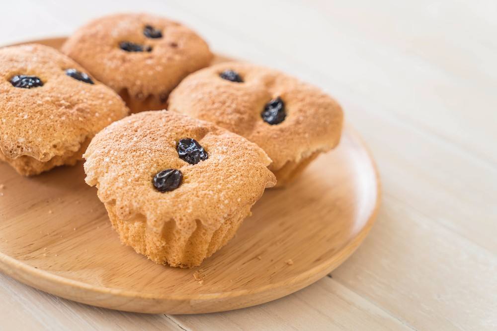 - يوزع الخليط على القوالب حتى ثلثيها، ويزين بالزبيب.