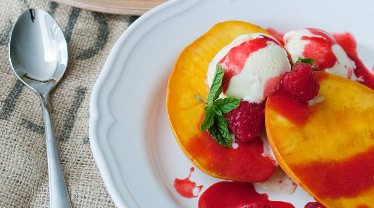 يوضع خدين مانجو على كل طبق مع 2 بولة آيس كريم ويصب عليها صلصة الراسبيري وينثر عليها الراسبيري الإضافي ويجمل بالنعناع.