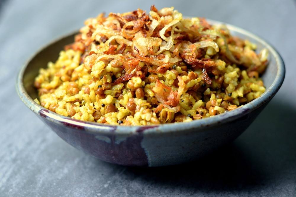 8. يضاف العدس إلى الأرز، ويقلب جيداً.