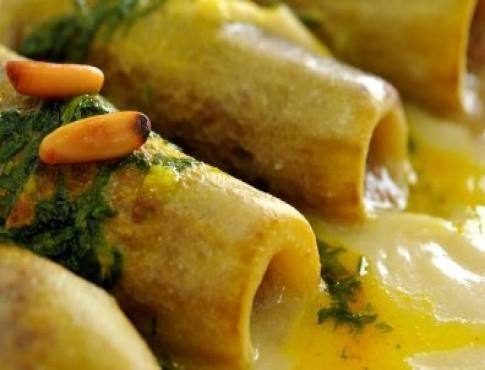 - ثم ضعيها في طبق التقديم صبى عليها اللبن وجمليها بالصنوبر.
