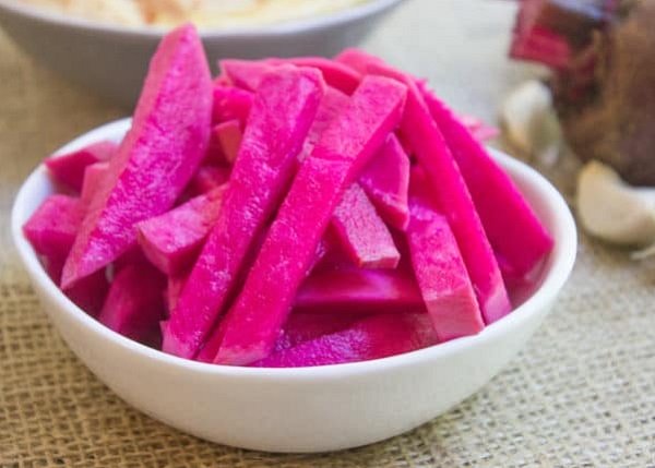 - نغسل اللفت من الملح ونصفيه جيداً ثم نضعه في مرطبان مع توزيع قطع الشوندر حتى يكتسب اللون المطلوب .
