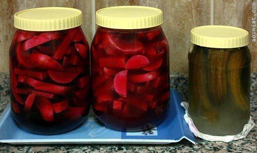 - نبدأ بغسل اللفت و تقطيعه قطع صغيرة ومستطيلة ونضعه فى البرطمان ونضع معه البنجر مقطع قطع صغيرة.
