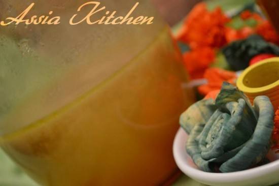 1. فى إناء يوضع به كل المقادير وعلى النار لمدة 20 دقيقة حتى الغليان ، ويصفى المرق بعد النضج و يوضع في حاوية زجاجية .