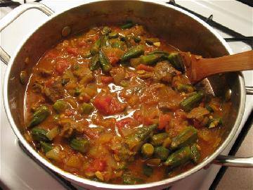 هنضيف الملح والكزبرة والبامية والتمر هندى و الماء الساخن ونقلب على خفيف.