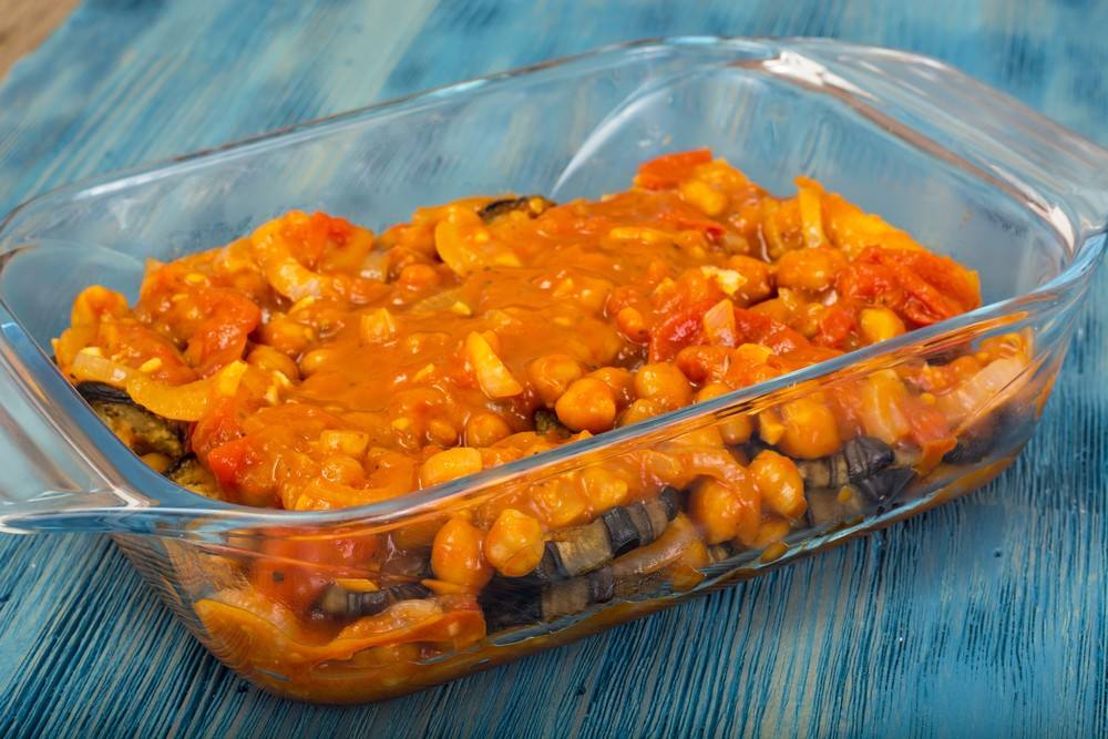 - يوضع مقدار من خليط الحمص في الصينية، وترص فوقه شرائح الباذنجان.