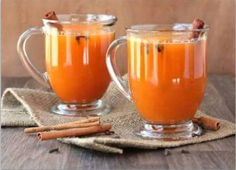 - نحضر عصير التفاح ونضعه على النار في اناء مع عصير نصف البرتقالة .
