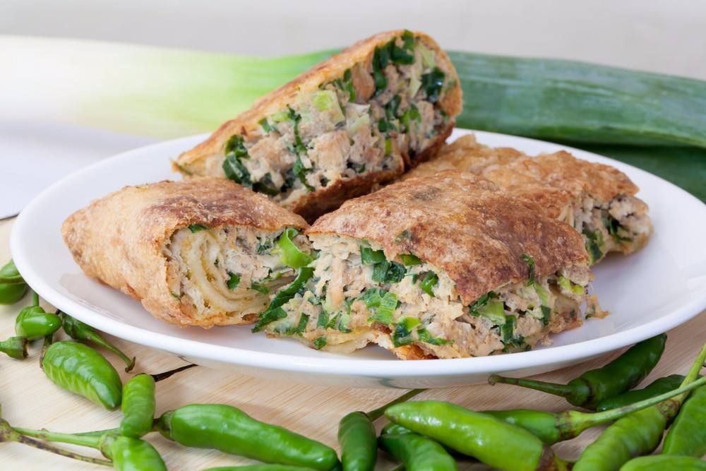 8. تحشى بخليط الدجاج، مع مراعاة ان تكون الحشوة في المنتصف، ويطبق عليها اطراف العجين لتصبح مربعة الشكل، ويضغط على أطرافها جيداً حتى لا تفتح عند القلي.