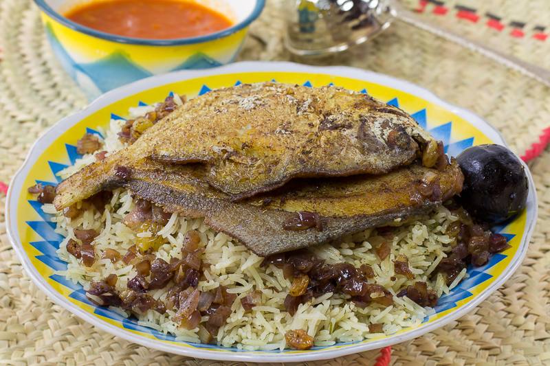 – ضعي الأرز في صحن التقديم وتوضع سمك الزبيدي فوقه ويزين بالحشو.