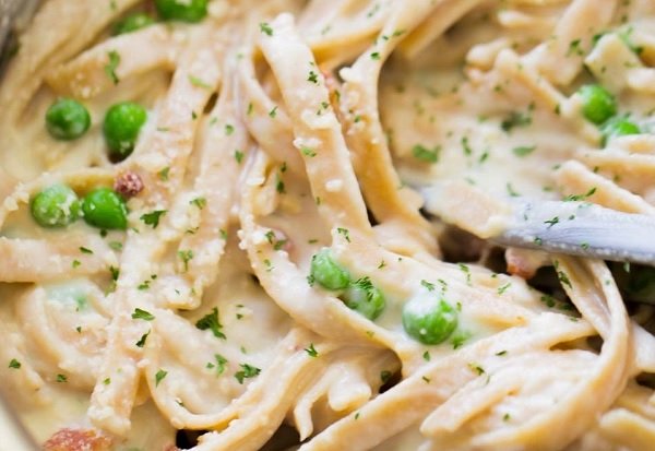 معكرونة بالبشاميل سهلة ، يتكون طبق السباغيتي هذا من شرائح السلامي والبازلاء ومزيج من جبن البارميزان والشيدر إضافة إلى صلصة ألفريدو المميزة مع مذاق كريمي شهي جداً وهي وجبة سهلة وسيحبها جميع أفراد العائلة على العشاء .