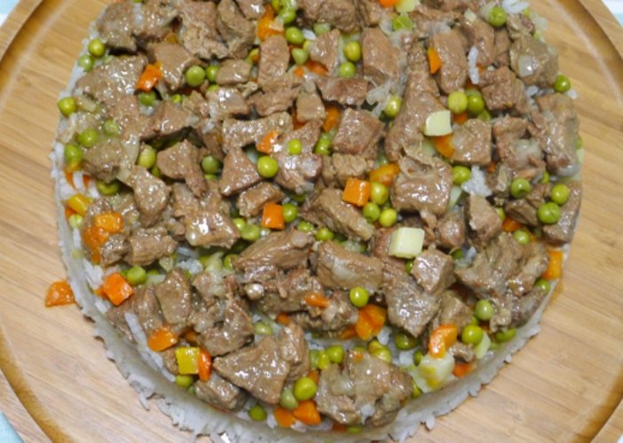 8- في وعاء عميق نضع اللحمة في قاعها ونصفها جيدا ثم نضيف الرز بالبازلاء ونحاول الضغط على سطحها قليلا