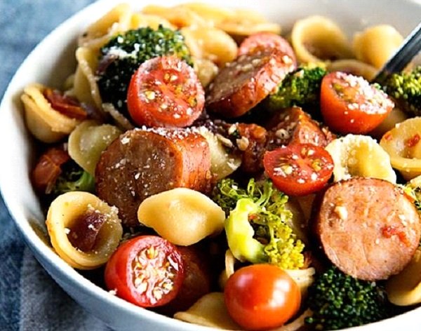 مكرونة بالسجق، وصفة بسيطة وصحية ومناسبة للريجيم فهي تحتوي على سعرات حرارية قليلة كما أنها شهية وسهلة التحضير مكونة من الباستا والبروكلي والسجق وغير ذلك من المكونات والتوابل اللذيذة .