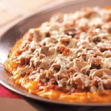 - ترص المكرونة فى قاعدة صينية الفرن و يوضع عليها اللحمة ثم الصلصة و الزيتون و الزعتر و تغطي بالكامل بالموتزاريلا.
