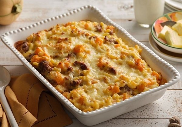 - نخلط في وعاء كلاً من المكرونة ونصف كمية البشاميل ونصف السجق والخضار وبرش الجبنة .