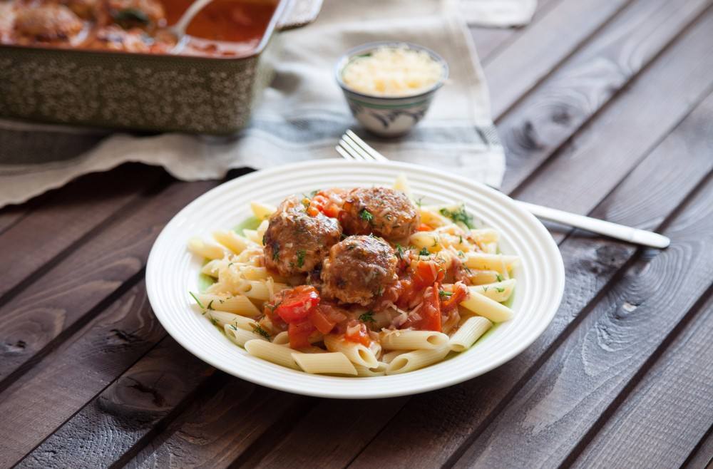 14. توضع المكرونة في الطبق، ويوضع فوقها كرات اللحم والصوص.