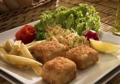 - قدمي مكعبات السمك المقلية مع البطاطس المحمرة والسلطة.