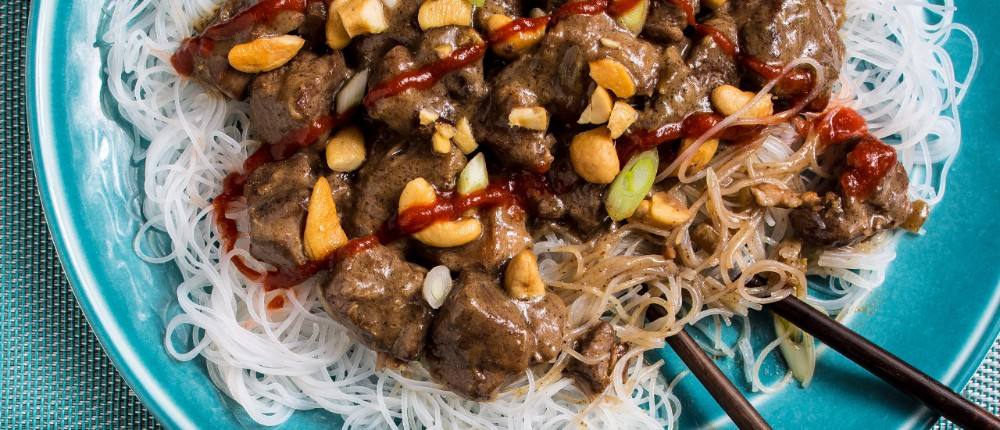 7. ضعي الكاجو و البصل الأخضر فوق قطع اللحم.