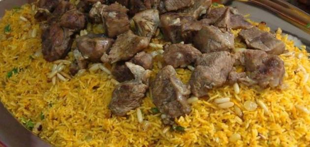 - نخرج اللحم من الفرن، ونضع الأرز في وعاء لائق للتقديم، ونضع فوقه اللحم، ونرش رشة من الزعفران، ونقدمه وهو ساخن، ويقدم بجانبه الكثير من المخلالات، واللبن الرائب، وسلطة الخضار الخضراء الحامضة، بالإضافة إلى قرن من الفلفل الأخضر الحار.