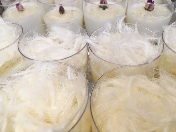 - عندما يبدأ القوام يسمك نضيف ماء زهر وغزل البنات ونحركهم ثم نصبهم في زبادي التقديم .