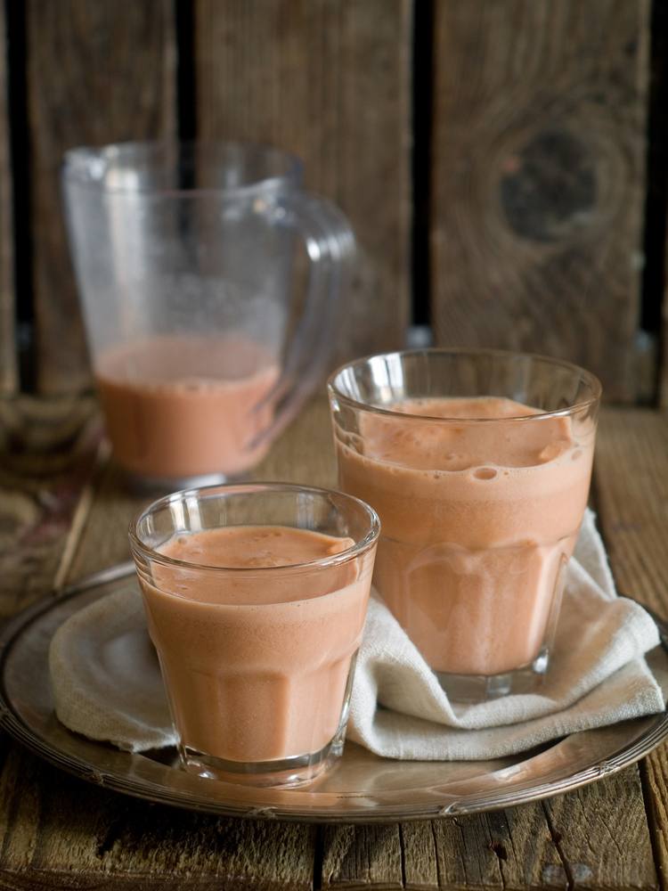 - إخلطى العصير مع الماء البارد وحليب البودرة والسكر جيداً و قدميه .