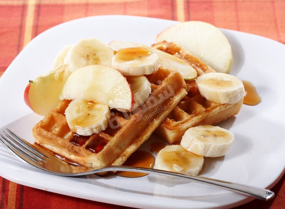 - يصب العسل على الوافل، ويرص فوقه شرائح الموز والتفاح.