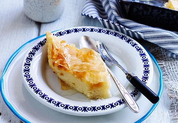 - نحمّي الفرن لدرجة حرارة 170 وندهن صينية الفرن بالزبدة . ندهن واحدة من الرقائق بالزبدة ونطويها من المنتصف ثم ندهن الوجه العلوي بالزبدة ونكرر العملية بالرقائق المتبقية . نضع 4 طبقات من الرقائق في الصينية ونسكب مزيج الكاسترد ثم نضع باقي الرقائق فوق المزيج وندهنها بالزبدة . نضع الصينية في الفرن لمدة 45 دقيقة .