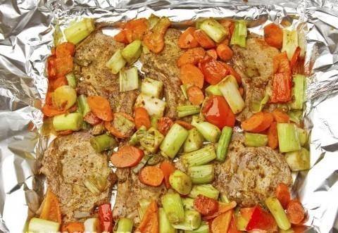 - ثم قومي بتغطية اللحم والخضروات بالفويل تمامًا.