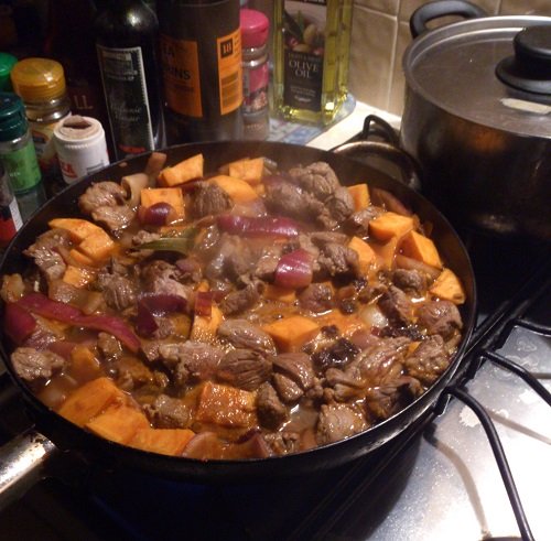 - ضعي الثوم، عودي القرفة، الغار، القرنفل، جوزة الطيب، الهال، الماء ومكعبي مرقة الدجاج، غطيهم واغليهم لــ 60 دقيقة أو حتى ينضج اللحم بالكامل، أخرجي عودي القرفة، الغار، والقرنفل، وتخلصي منهم.