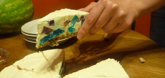- نفرغ الخليط من القالب، ونقطع كيكة الجلي إلى مربعات حسب الرغبة.