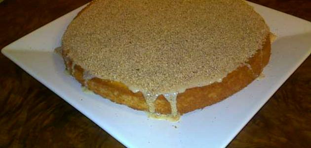 - دهن وجه الكيكة بالحليب المكثف، ورشها بالسميد المُحمّص.