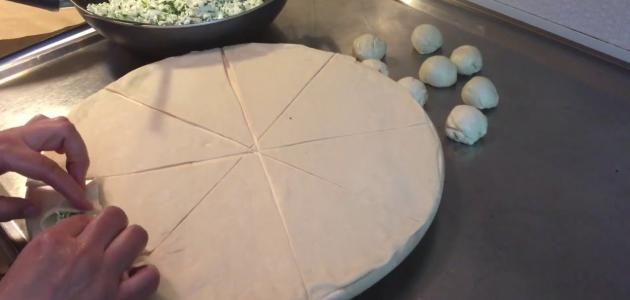 - تُفرد العجين بشكل دائري وبالسماكة المرغوبة، ثم تُوضع كمية من الحشوة في منتصفها، ثم تؤخذ العجين من الجانب الأيمن والأيسر ويتم لصقهما ببعضهما بشكل مائل، ثم يؤخذ الجزء السفلي ويُلصق مع الجزأين الأيمن والأيسر، وبذلك تكون الفطيرة أخذت الشكل المثلث.
