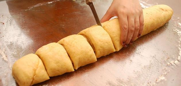 - تُلف العجينة حول بعضها البعض بشكل أسطواني، ومن ثم تُقسم باستخدام سكين حادة إلى دوائر بطول ثلاثة سنتيمترات تقريباً.