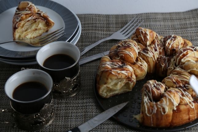 2. تُغطى وتترك في مكان دافئ لمدة ساعة ثم تُعجن مرة أخرى وتُفرد على سطح طاولة مرشوش بالقليل من الدقيق على شكل مستطيل ثم توضع الحشوة وتُلف جيدا ثم تُقطع إلى دوائر وتُرص جنبا إلى جنب في صينية مدهونة بالقليل من الزبدة.
