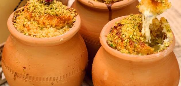 - نضيف باقي الخلطة الأولى إلى الصينيّة بحيث يكون الخليط على شكل طبقات، ومن ثمّ ندخلها إلى الفرن على درجة حرارة عالية حتى تحمرّ، ونسكب القطر عليها وتقدّم.