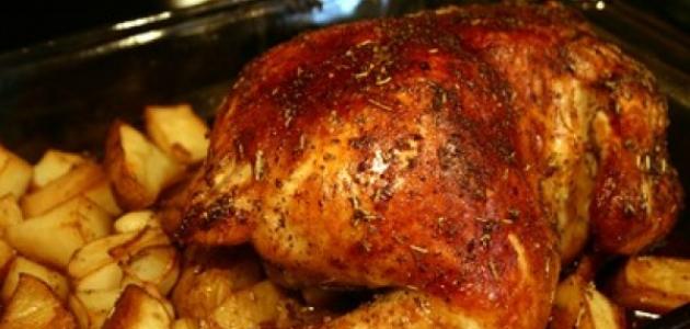 - نخفّف حرارة الفرن لتصبح متوسّطة الحرارة ثم نقلّب الفرخة؛ بحيث يصبح الصدر للأعلى.