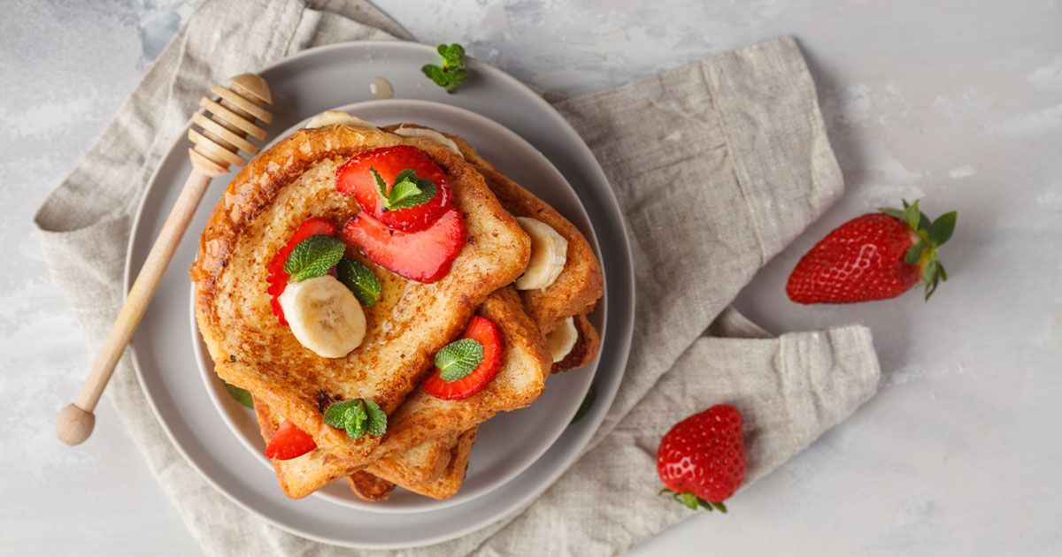 4- ضعي الفرنش توست في طبق، زيّني بالفراولة والموز وقدّمي الطبق على سفرتك. ألف صحة!