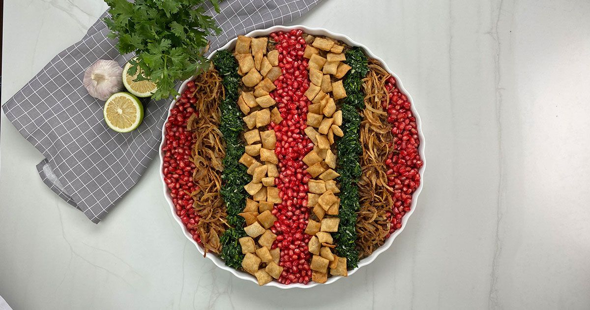 9- أسكبي المزيج في طبق التقديم وزيني وجهه بالمان، باقي كمية البصل والكزبرة والخبز.