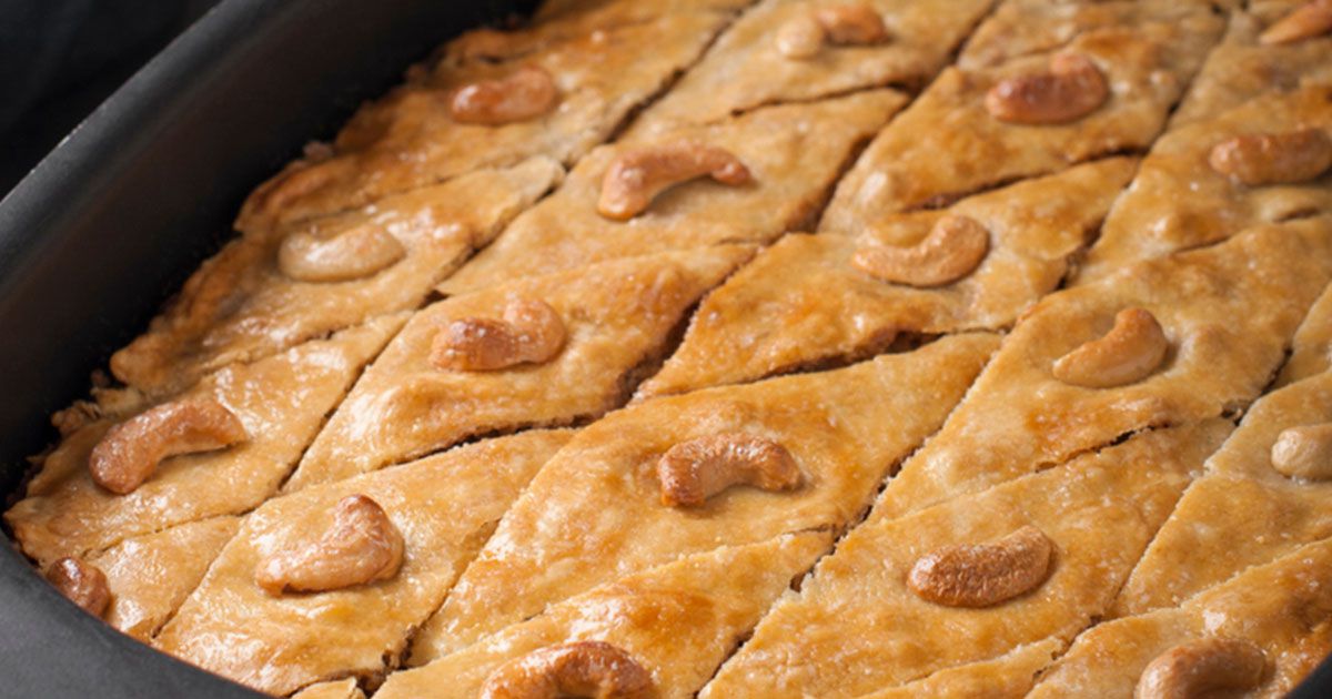 5- قطّعي البسبوسة، زيّني بالكاجو وقدّمي الحلى على سفرتك. ألف صحة!
