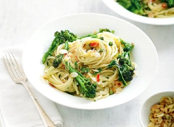 المكرونه بالبروكلي ، هذا الطبق المغذي المزين باللوز المحمّص ، تزداد فائدته مع الليمون الذي يتفاعل مع البروكلي كي يستخلص جميع الفوائد منه ، و غني ايضاً بنكهة الفلفل الحار .