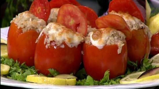 - احشي الطماطم بالخلطة ثم ضعي الجبن الموزريلا على الوجه وادخليها الفرن إلى تحمر وتقدم ساخنة